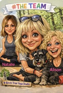 A wonderful TRINITY – Karen is supported by two other FRYOG teachers, Alison Dolley & Natalie Penniall, who run weekly classes at the Studio. These awesome, very experienced teachers have taught at the studio for over 15 years, adding their own styles and expertise to the Studio’s timetable.Hugo is the latest member, he is often on hand for a friendly greeting & reassuring lick-and to demonstrate the best “Downward facing dog “!!!